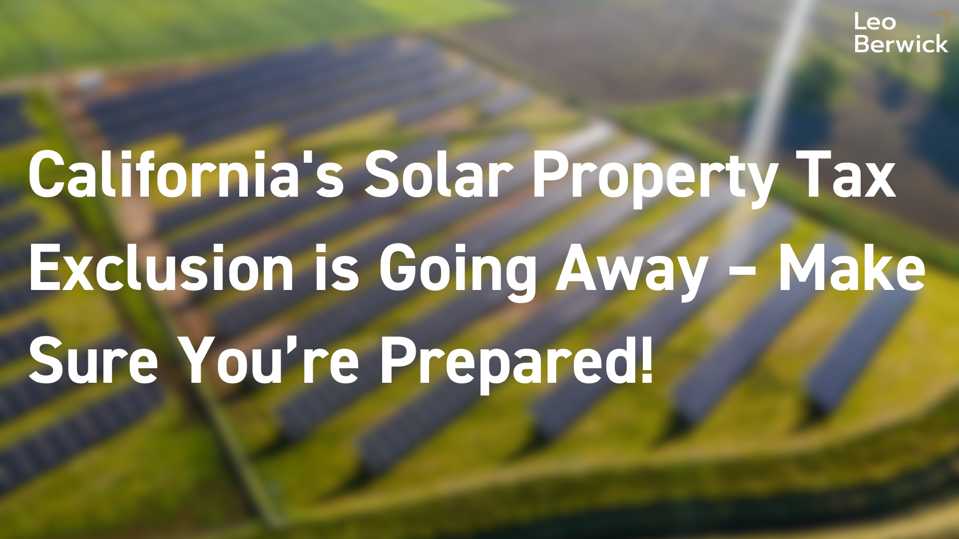 Leo Berwick has a broad range of experience with the solar exclusion and can assist with providing tailored advice based on your circumstances and assist navigating through the ever-changing California property tax landscape. Brian Heard, Leo Berwick’s Property Tax Leader, has worked on a broad range of infrastructure and renewable energy deals for 24 years and is available to assist with California property tax solar exemption projects. You can contact him at brian.heard@leoberwick.com or 214-215-1681.