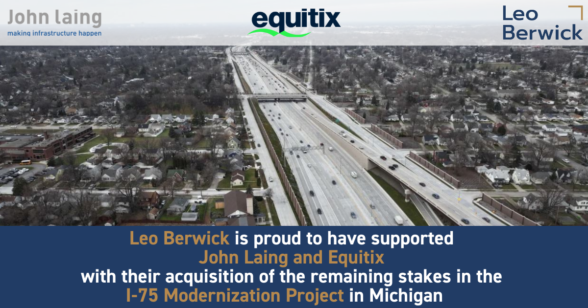 Leo Berwick is proud to have supported JOHN LAING INVESTMENTS LIMITED (JLIL), the holding company for joint shareholders Equitix and John Laing, with its acquisition of the remaining shareholder stakes in the I-75 Modernization P3 in Michigan. Prior to this acquisition, JLIL previously held a 70% stake in Oakland Corridor Partners, the consortium that owns the P3 project.