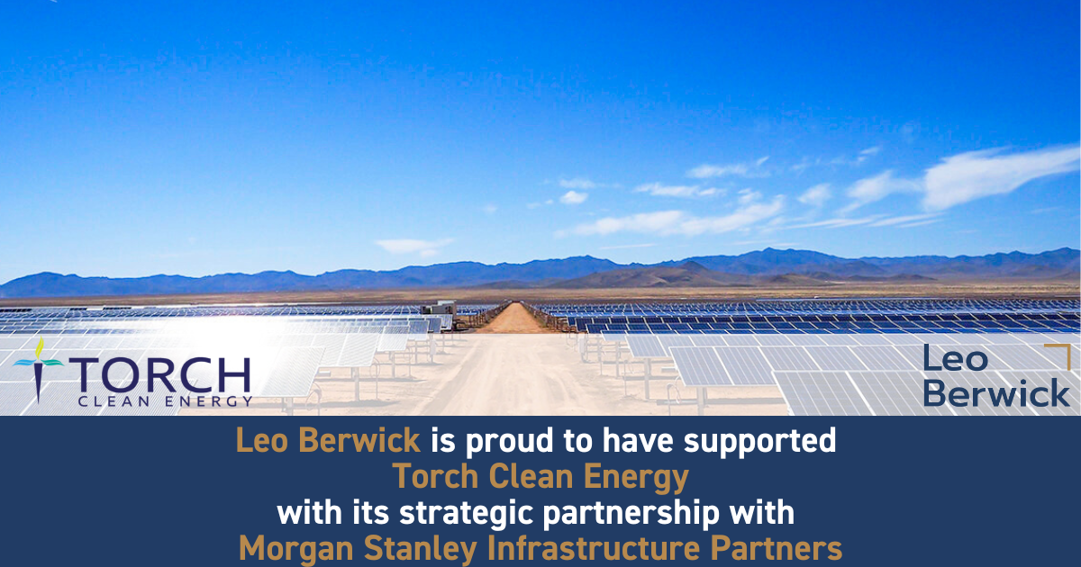 Leo Berwick is proud to have supported Torch Clean Energy with its strategic partnership with Morgan Stanley Infrastructure Partners, enabling it to transition from a development platform to an integrated clean power platform with capabilities across development, construction and asset management.