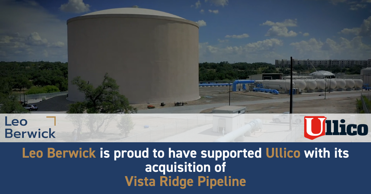 Leo Berwick is proud to have supported Ullico Infrastructure Partners, LLC with its acquisition of a majority equity interest in Vista Ridge Pipeline from affiliates of Ridgewood Infrastructure. The Vista Ridge water pipeline delivers approximately 20% of San Antonio’s fresh water under a long-term concession agreement with the San Antonio Water System. This asset compliments Ullico’s growing portfolio of utility investments that offer essential services in supportive regulatory environments.